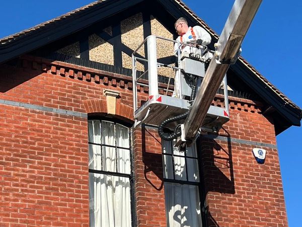 With our own truck-mounted access equipment, we complete high-level projects safely and efficiently — including detailed gable preparation and painting, as shown in the images.